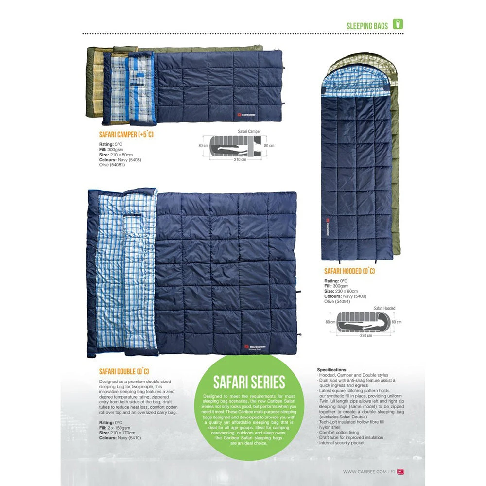 Designed to meet the requirements for most sleeping bag scenarios, the new Caribee Safari Series not only looks good, but performs when you need it most. These Caribee multi-purpose sleeping bags designed and developed to provide you with a quality yet affordable sleeping bag that is ideal for all age groups. Ideal for camping, caravanning, outdoors and sleep overs, the Caribee Safari sleeping bags are an ideal choice.
