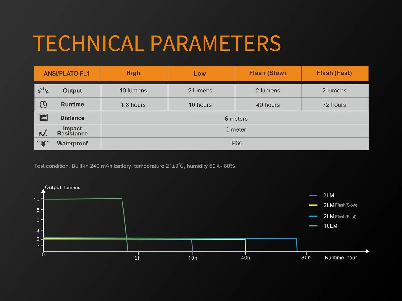 - Low – 2 lumens/10 hours