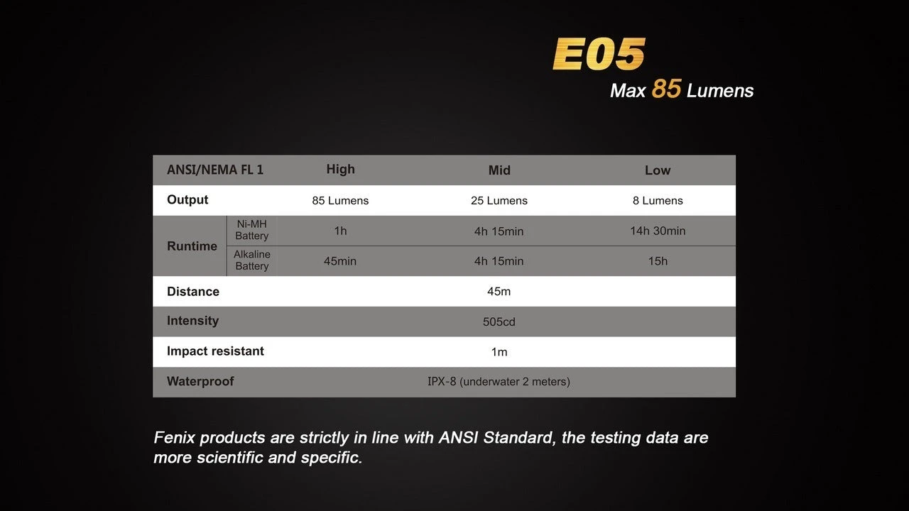 A keychain light with high lumen output? The Fenix E05 is your answer! With a max output of 85 Lumens. Never worry about not being able to see in the dark, or searching for a lost item, the Fenix E05 will help you find it. This compact light is only 2 inches long and easy to use, no switches or buttons, just a easy turn of the head will activate the phenomenal Fenix Flashlight. Choose your own color, the Fenix E05 comes in various colors including black, blue, and purple. This light will last a lifetime, made from durable aircraft aluminum. Easy to carry and easy to use what else could you look for in a a keychain light.