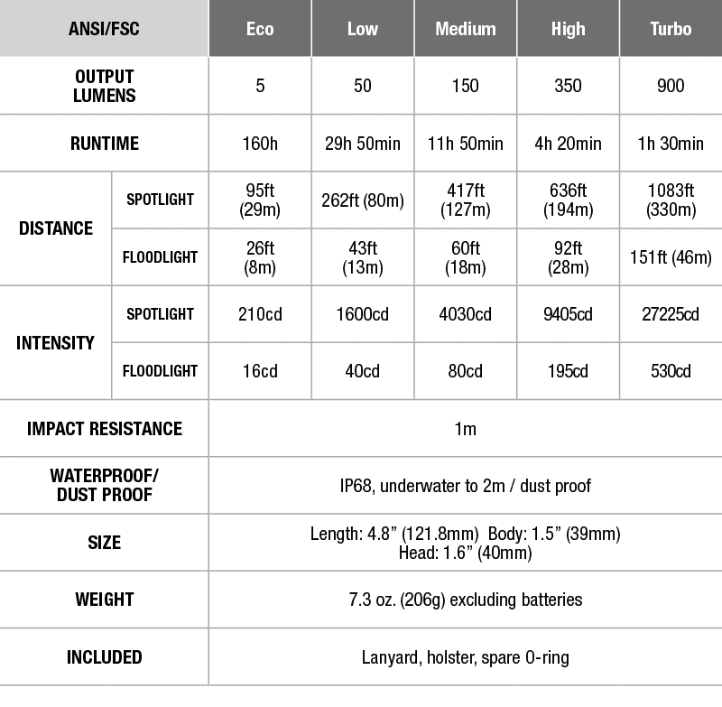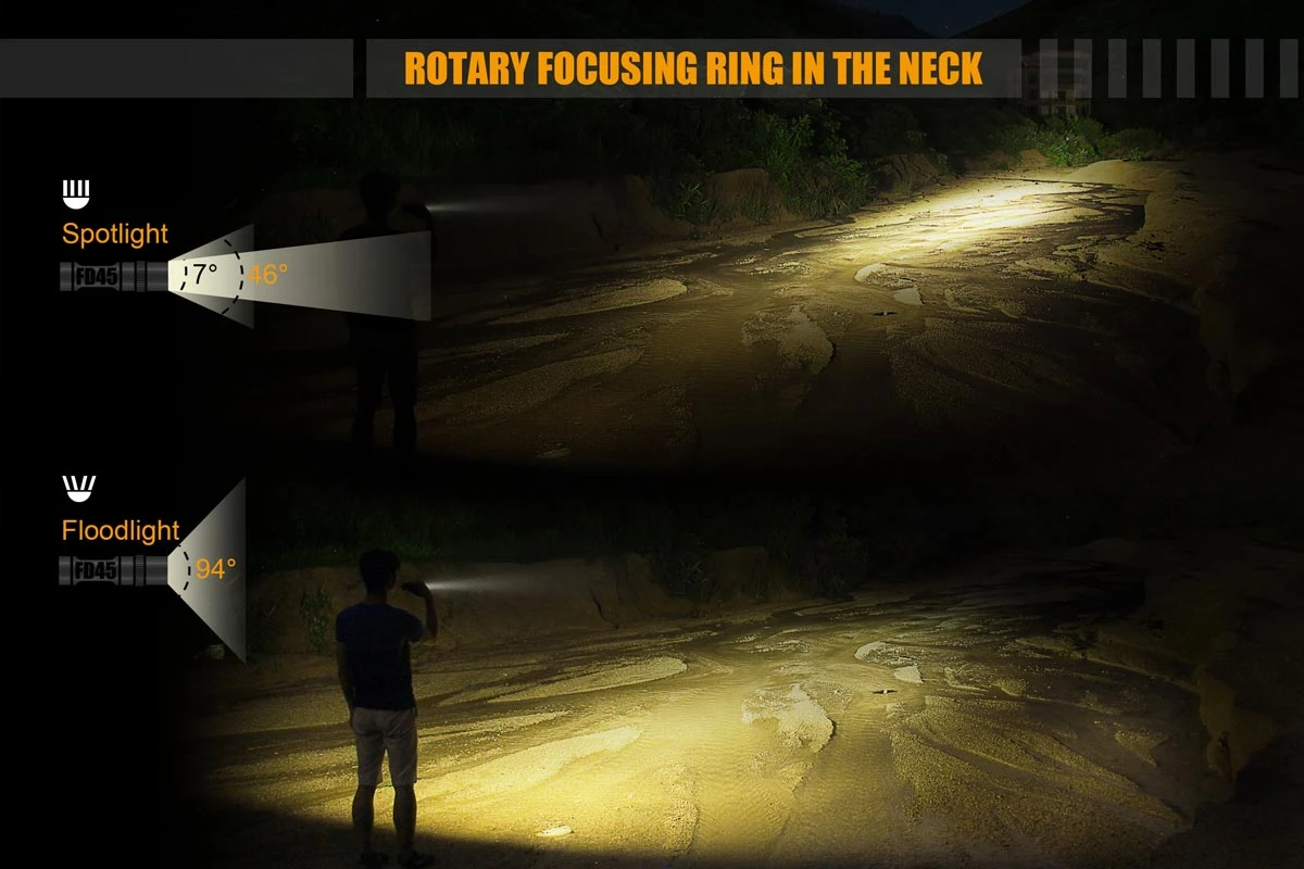 The Fenix FD45 Focus Flashlight features a focusable beam which, by a simple twist of the head, allows you to go from a 94° floodlight (for greater close-in visibility) to a tighter 7° spotlight (for far distance viewing). Fitted with a neutral white LED, the Fenix FD45 has a maximum output of 900 lumens and a maximum beam distance of 1,083 feet. Powered by readily available 4 AA batteries, this flashlight has five brightness levels plus Strobe and SOS. This compact tool is waterproof/dustproof and is great for general use and outdoor activities, where versatility of light and convenience of AA batteries are in great need.