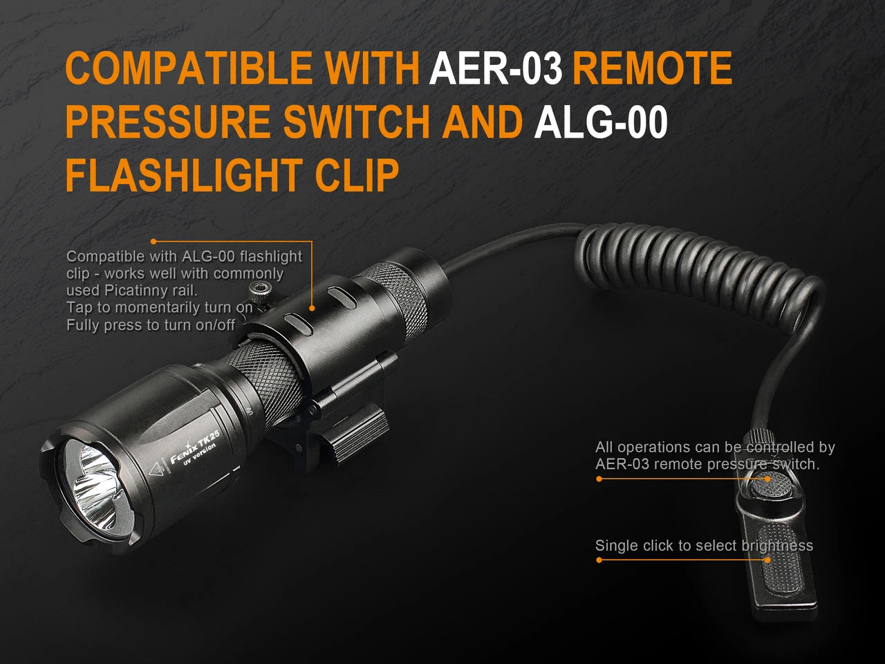 - Compatible with the Fenix AER-03 Remote Pressure Switch and the ALG-00 Flashlight Mount
