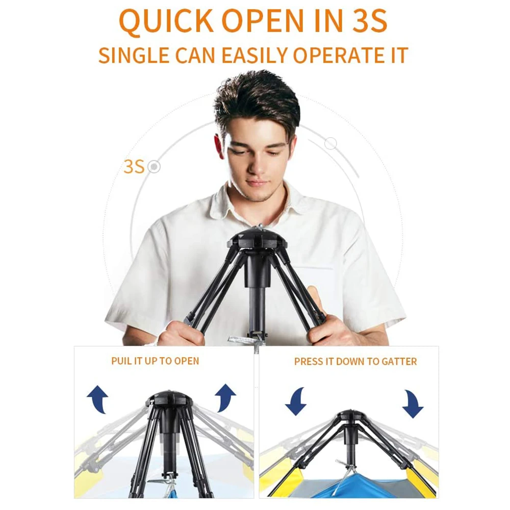 - Easy to Set-up and Fold-Down: Lay out the tent, lift up the top of the tent after spreading 4 arms and it will automatic installation in 3 seconds. Take down: Press down on the short struts and please apply force there, the tent will fold inwards and be in a state to pack away.